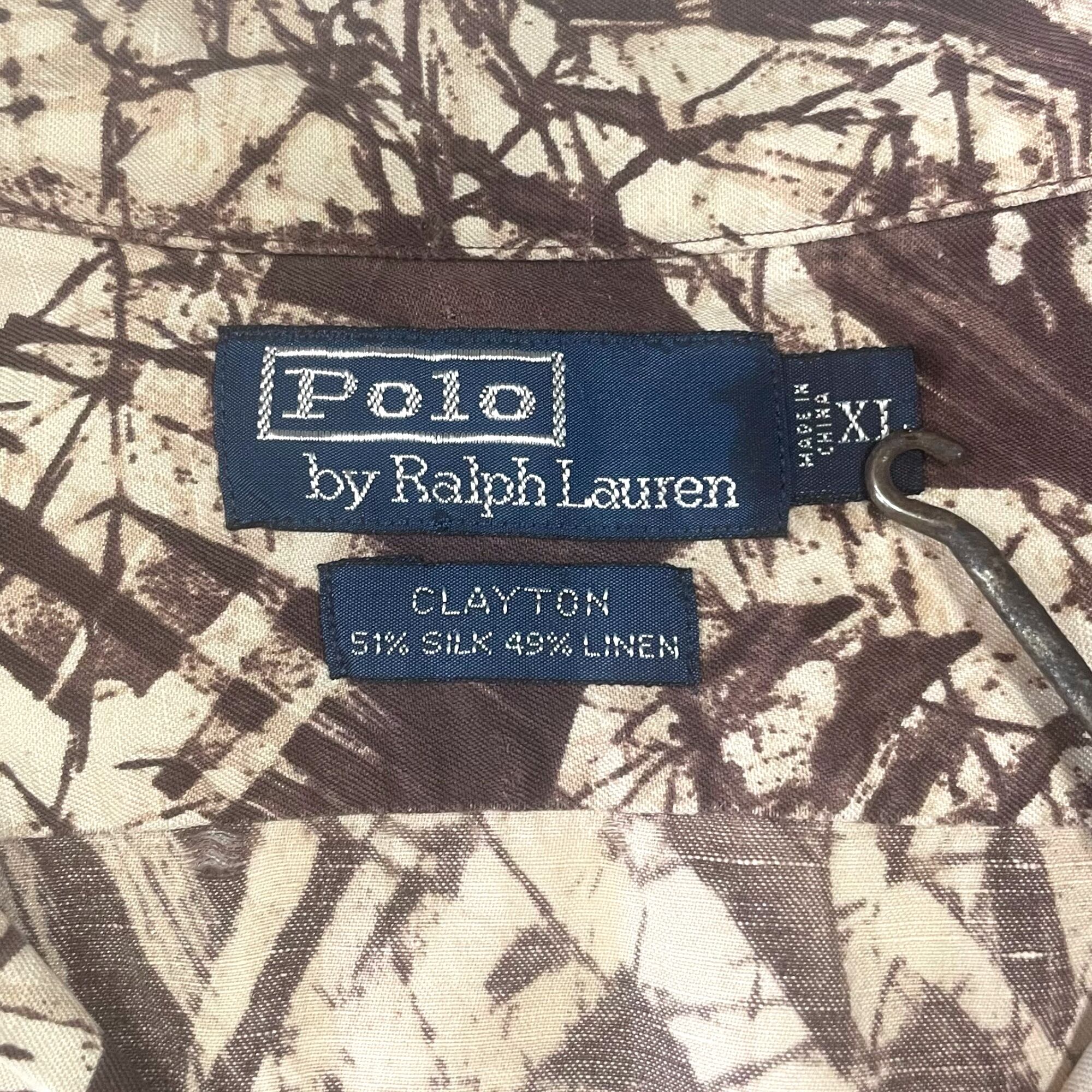 90年代ラルフローレンのCLAYTON,シルクリネンのハリのある生地感にブラウンベースの上品なハワイアンシャツ。スレはありますが着用に支障をきたすダメージはございません。年々高騰してきているオールドのラルフローレン。オープンカラーシャツはなかでも人気のアイテムです。