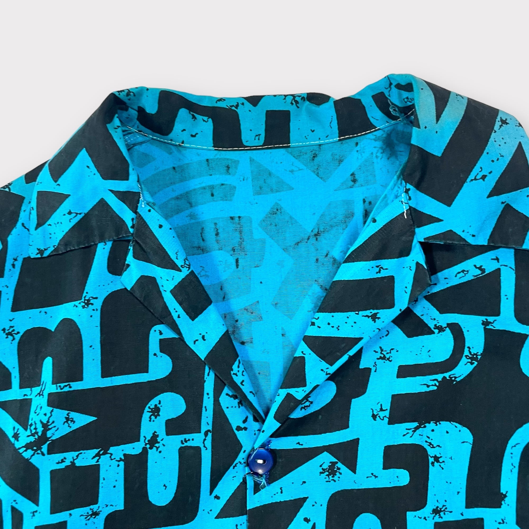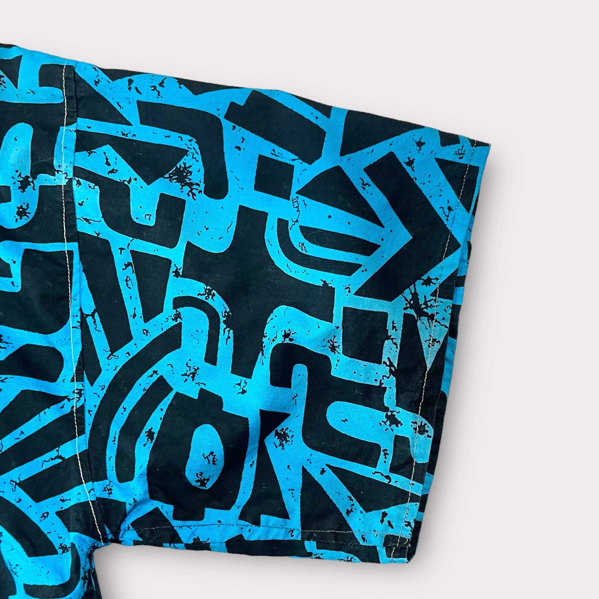 【商品説明】ビンテージのハンドメイド総柄シャツ。年代は不明ですがそこそこ古いものになるかと思います。ターコイズにブラックの総柄パターン。唯一無二の1着です。