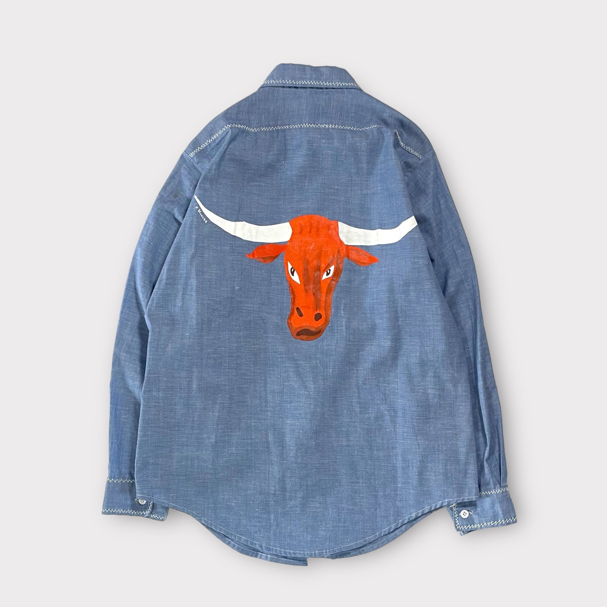 【商品説明】70年代Searsのシャンブレーシャツ。ポリ混のパーマネントプレスト仕様。バックにはおそらくテキサス大学のスポーツチームの象徴ロングホーンがペイント。襟、肩、袖には細かいステッチも入った唯一無二の1着です。