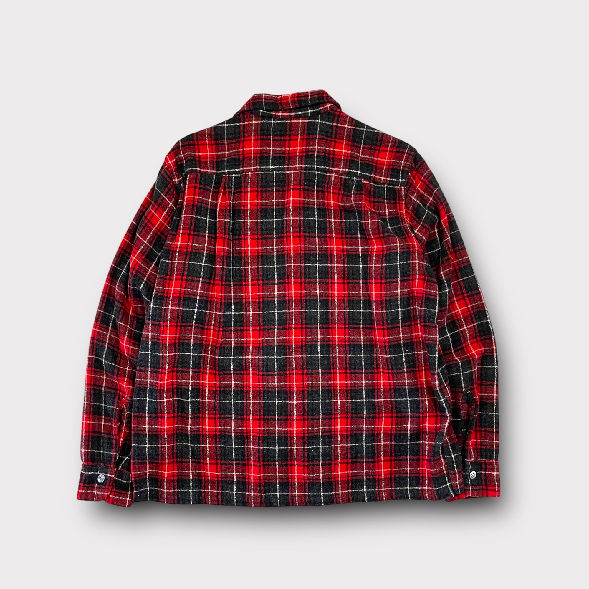 50〜60年代ピルグリムのウールループカラーシャツ。searsのプライベートブランドとして1905年から1964年まで存在したブランド。ループカラーでボックスシルエットに赤黒の素晴らしいカラーリング。年代特有の縮み、虫食いのないグッドコンディション。小さいものが多い中着用しやすいサイズ感です。